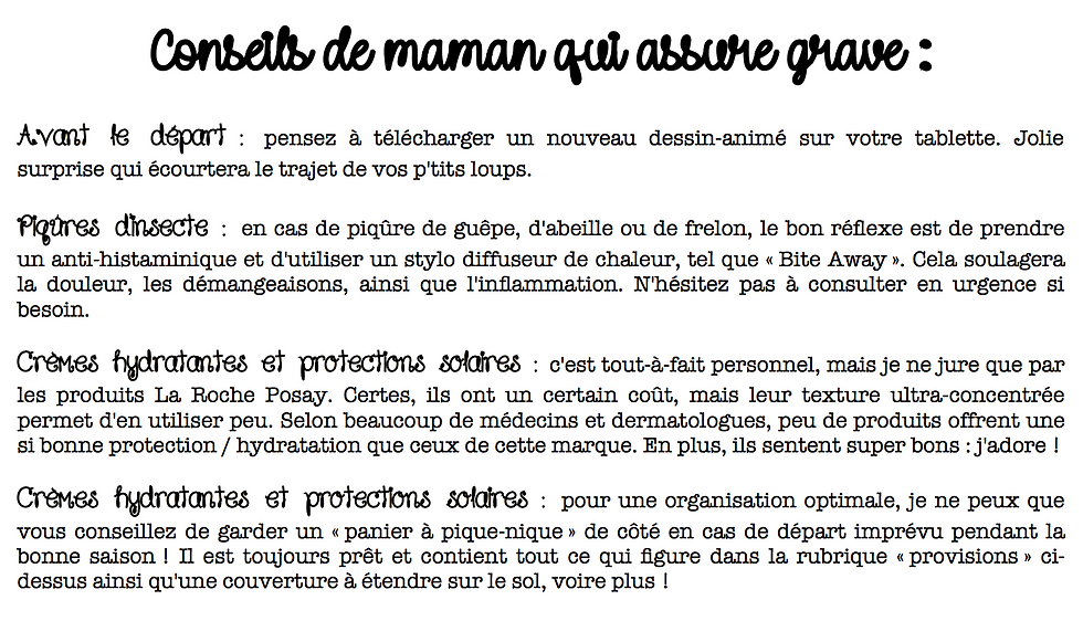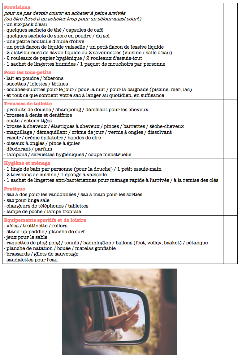 Alors voici une check-list que vous pourrez consulter et cocher à foison afin de ne rien oublier lors de vos prochains séjours en famille à la bonne saison. Je ne manquerai pas l'occasion de faire une liste version "saison froide" - bien qu'en ce moment on se demande si un jour l'été arrivera - et une version pour les week-ends à l'hôtel, qui indiquera ce dont on a besoin lors d'un séjour citadin.